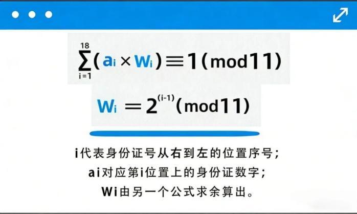 “校验码”是经由过程身份证前17位数字计算出去的。那套算法采纳的是MOD 11-2(与模11)邦家规范算法,经由过程添权乞降、与余换算后,校验码字符值会正在0到10之间。