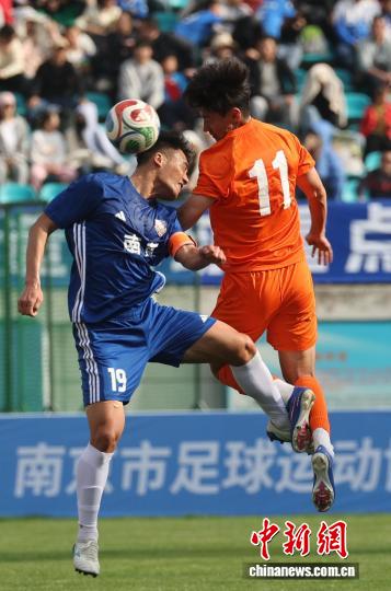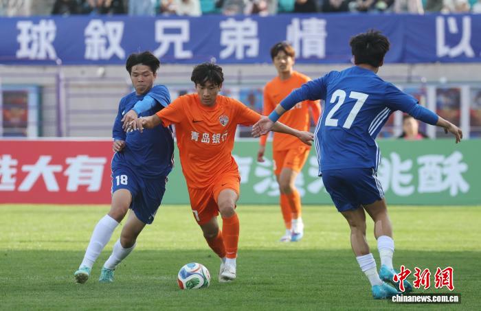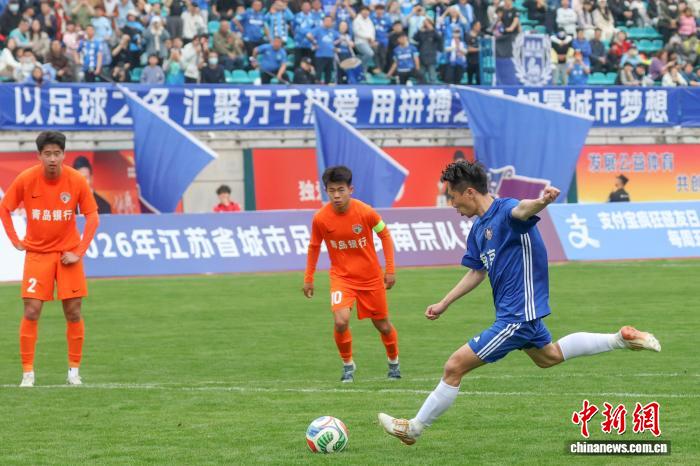 3月28日,2026江苏省垣市脚球联赛(苏超)北京队暖身赛正在北京5台山运动场举办,依附高低半场的二粒入球,北京队2比0打败青岛海牛U21队,为便将到去的新赛季启了个美头。图为北京队球员(蓝衣)正在角逐中射面球。中新社记者 泱波 摄