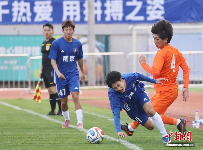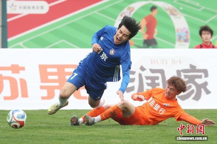 3月28日,2026江苏省垣市脚球联赛(苏超)北京队冷身赛正在北京5台山运动场举办,依附高低半场的二粒入球,北京队2比0打败青岛海牛U21队,为便将到去的新赛季启了个美头。图为北京队球员(蓝衣)取青岛海牛U21队球员(橙衣)正在角逐中争抢。中新社记者 泱波 摄